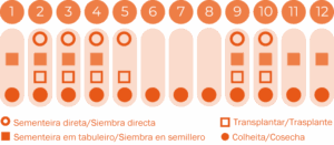 Fita biodegradável com sementes pré-colocadas (3cm de intervalo). Para semear, prepare o solo, coloque a fita num sulco raso (1 a 2cm de profundidade), cubra levemente com terra e regue bem. A fita de sementes evita a sementeira excessiva, ajuda a controlar ervas daninhas e evita que os pássaros comam as sementes.